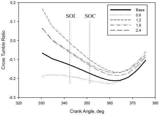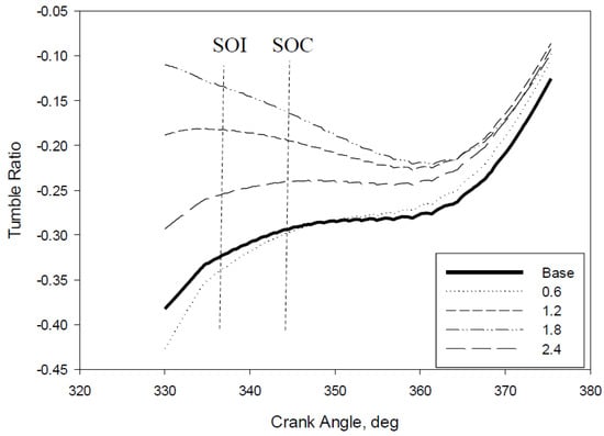 Figure 11 shows the RCT for the different lengths of GVD against the crank angle before approaching the TDC. RCT is defined as the rotational ratio of airflow on the cross tumble axes [40]. In combustion theory, the enhancement of RCT facilitates the increment of turbulent flow and assists in homogenous mixing of the fuel and air along the piston-bowl. Nevertheless, RCT has a close correlation with Rs and RT. Bari et al. found that in order to improve RCT in a CI engine, Rs and RT values need to be improved [41,42]. Prasad et al. reported that enhancing the RCT air motion is a crucial issue, as it has an impact on increasing the air-fuel mixing process, achieving faster burning rates, increasing indicated efficiency, and improving the air management [43]. As previously mentioned, the use of higher viscosity fuels such as emulsified biofuel will deteriorate the atomization process, subsequently decreasing the cone angle and increasing the length of penetration. Hence, with the correct length of GVD, RCT would be able to significantly break down the length of penetration, which is expected to widen the cone angle during the injection period. Based on the figure, the 0.6D (L) GVD shows the highest magnitude of values compared to the base engine and other models of GVD. It is noticeable that the 0.6D (L) GVD can produce a homogeneous mixture during compression and consequently improves the lateral flow of air within the cylinder.