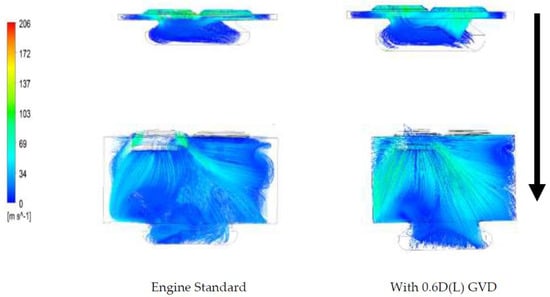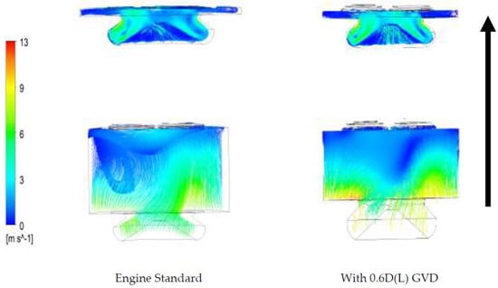 Figure 12 illustrates the intake stroke of the streamline of 10° and 100° crank angle (CA). During the intake stroke at 10° CA, the airflow was initially induced through the SCC piston. As a result of the lack of guidance in the intake stroke, tumbled flow occurred when the intake valve was opened. However, when considering the 0.6D (L) GVD, the in-cylinder air flow phenomena behaved differently. When the intake valve was opened, the airflow initially produced swirl. From the graph, it can also be seen that in-cylinder airflow velocity improved when using the GVD compared to that of the standard engine. This outcome is crucial to enhance the in-cylinder airflow by promoting the atomization of heavy molecules, like emulsified biofuels. The engine that does not use vanes showed lower air velocity in the combustion chamber during the intake stroke. These results were supported by studies of Heywood [44], where it was recommended that turbulence intensity in the combustion chamber could be increased by improving the vortex flow during the intake stroke.