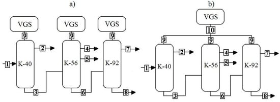 In Figure 3a,b shown two different technological schemes of the reconstructed VGS based on LRVP and mechanical booster pumps.