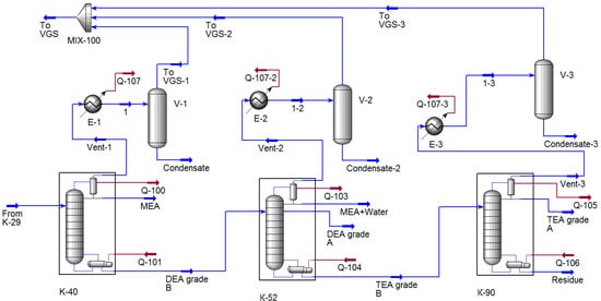 At chemical plants, ethanolamines are produced by oxyethylation of ammonia using water as a catalyst [1,2,3]. The product stream produced from the reactor block consists of MEA (monoethanolamine), DEA (diethanolamine), and TEA (triethanolamine), which are separated into components in the rectification columns [4,5,6]. Due to the low thermal stability of the separated components, as well as rather strict requirements for the resulting products, the rectification process is carried out under vacuum, with a residual pressure of up to 6.65 mbar [7]. The steam ejection pumps (SEP) used as vacuum-generating systems (VGSs) are obsolete and are characterized by increased consumption of expensive energy resources [8], so it was decided to replace the existing vacuum pumps with a single VGS based on the liquid ring vacuum pump (LRVP) [9]. The system layout was determined by mathematical modeling using UMP (universal modeling program) tools.