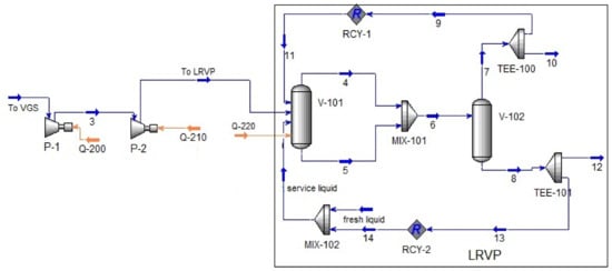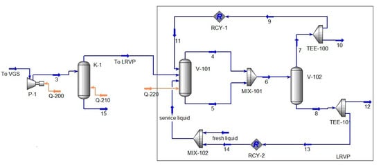 The calculation schemes of the VGS are shown in Figure 4 and Figure 5. COMP Module (P-1 and P-2 modules in Figure 4 and Figure 5) modeled a booster pump, the compression ratio of which was determined by the characteristic and fixed in the module specification. All processes occurring in the LRVP were calculated using the provisions described in [29].