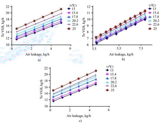 The empirical coefficients of equation C and B (15) were defined for certain equipment and depend on pressure, so their application in this case may also lead to an error. Therefore, the amount of flowing air was determined by conducting a numerical experiment, in which the condensation temperature in the “tail” condensers changed and the output of non-condensing gases was fixed.