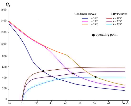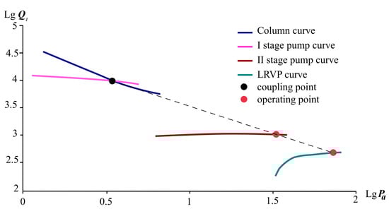 The correlation of the characteristics of the equipment for the circuit figure is shown in Figure 7. Decimal logarithms of volumetric flow and pressure values are shown on the graph for easier display.