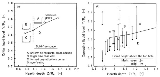 A sophisticated mathematical model [34] also taking into account BF hearth geometry and operation parameters categorized the floating state of the dead man into four different groups: (A) completely floating with a flat bottom, (B) completely floating, but floating higher near the wall, (C) partly floating at the wall, and (D) completely sitting. The results are shown in Figure 3a, where the hearth depth is defined as the distance between hearth bottom and the taphole level. It can be seen that the floating state of the dead man depends strongly on the hearth (“sump”) depth and liquid level. The corresponding conditions of some Japanese furnaces were also examined by the mathematical model. As elucidated in Figure 3, the prevailing conditions (i.e., types B and C) of Japanese furnaces appear left of the vertical dashed line, while the aforementioned floating type A (i.e., completely floating with a flat bottom profile) appears right of the dashed vertical line, and is thus in conflict with the prevailing conditions.