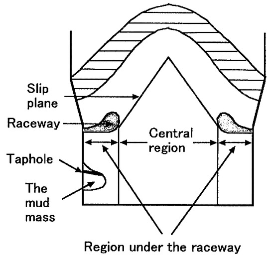 The dead-man state can be estimated by conducting a balance between the buoyancy of iron and slag in the hearth and the force pressing down on the dead man. The buoyancy force, which is a function of liquid level and dead man porosity, is relatively straightforwardly expressed. Nevertheless, the vertical force pressing down on the dead man is more complicated, since it is related to a set of furnace operating conditions, e.g., raceway length, gas drag and burden weight, as well as liquid holdup above the hearth liquids [34]. The BF lower part is schematically illustrated in Figure 4, where the dead man is divided into two particular regions based on the raceway length/gas drag intensity, i.e., a central region and a region under raceways [35].