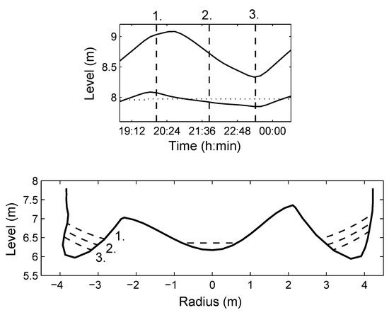 The bottom shape and position of the dead man depend on the liquid levels in the hearth and on the force acting on the bed from above. In a normal tap cycle, the liquid levels vary with varying outflow rates of iron and slag, due to the intermittent tapping, as the taphole is eroded during tapping, and because of the “competition” between iron and slag flow in the taphole [24]. Mainly based on balance equations of mass and force, the liquid levels in the BF hearth with two different dead man floating states were estimated and are shown in Figure 2, where the corresponding filtered electromotive force (emf) signals measured at the hearth shell are also depicted [25]. By comparison of simulated liquid levels and emf, Brännbacka [26] found that the iron level corresponds better to the emf signal. Comparing the maxima of the iron and slag level with the emf, this observation can also be confirmed in Figure 2. However, it should be mentioned that the variation in true liquid levels is very hard to measure, even though some indirect measuring methods have been proposed [27,28,29].