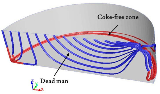 The internal state of the BF, as schematically illustrated in Figure 1, has been gradually revealed by extensive dissection investigations [2,3], which confirmed that there exists a stagnant column of coke particles in the lower part of the furnace. The stagnant column, where coke particles move downwards with a highly reduced velocity, was called “dead man” because it was earlier assumed to exert negligible influence on the whole ironmaking process [4]. However, this assumption was later been found to be incorrect. As a matter of fact, it is nowadays commonly believed that the dead-man state significantly affects the gas and liquid flows in the BF lower part, which, in turn, determine the temperature distribution within the hearth, the liquid drainage, as well as wear of the hearth lining [5]. In addition, the dead man appears to be rather “active” since it is usually claimed to have an average porosity of [2], and can be renewed in periods varying between a few days and some weeks.