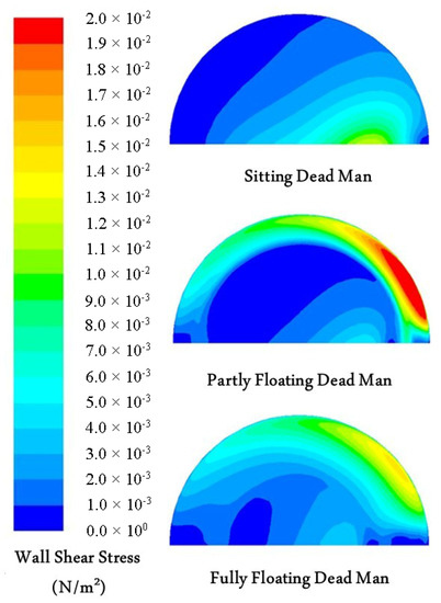 The possible hearth lining wear mechanisms include chemical reactions between the lining materials and molten liquids, abrasion and friction caused by coke particles in the hearth, as well as thermo-mechanical stress and flow-induced shear stress. The last one that is caused by the near-wall flow field can lead to lining erosion alone, and a combination of it with other mechanisms could give rise to more wear, eventually resulting in severe hearth damage. Thus, it is imperative to understand the shear stress in terms of its generation and distribution so that appropriate precautions can be taken to reduce the shear stress in order to prolong the campaign life of the hearth. The flow-induced shear stress has been studied mainly using CFD models, since no direct measurements of the BF hearth state variables exist [48,49,50,51,52,53]. The contours of the shear stress on the hearth bottom under different dead man states, calculated in [48,49], are depicted in Figure 9. It can be seen that with a sitting dead man, the high shear stress zone emerges in the interior of the hearth bottom, particularly below the taphole entrance. Nevertheless, the zone moves to the peripheral region when the dead man partly floats, with a coke-free zone emerging at the hearth corner. In addition, a fully floating dead man state could mitigate the hearth bottom shear stress to some extent, since the shear stress distributes quite uniformly. This would imply that in furnaces where the dead man has started floating completely, the hearth bottom erosion would not progress much.