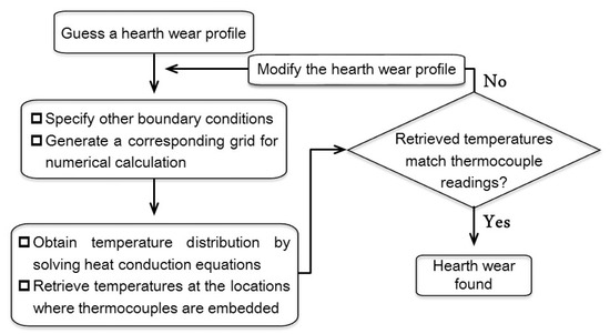 In view of the inherent coupling between liquid flow and heat transfer, an intensive circumferential flow leading to severe erosion is usually linked with an increased heat load on the hearth lining materials. Temperatures measured by thermocouples embedded in the hearth lining can therefore be utilized to predict the hearth wear profile. In practice, the 1150 °C isotherm is often regarded as the internal liquid–solid interface in the hearth. In order to estimate this isotherm, mathematical models where an inverse problem of heat transfer is solved have been proposed [31,54]. It should be stressed that 1150 °C is the lowest temperature at which carbon-saturated iron is present in liquid form, and consequently only heat conduction is solved in this kind of hearth wear profile model. A basic algorithm for estimating the hearth wear profile is outlined in Figure 10.