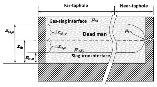 In the BF hearth, the void space is occupied by the immiscible liquid iron and slag. As a result of gravity, the rivulets of molten iron and slag from the cohesive zone [58] will eventually separate into two different layers, i.e., the upper slag layer and the lower iron layer. Two interfaces, i.e., gas–slag and slag–iron, are thus formed in the hearth. In practice, a tap starts when one taphole is drilled open. A substantial pressure drop in the vicinity of the taphole can be formed as the high-viscosity slag is driven to flow through the dead man towards the taphole. As a result, the gas–slag interface is tilted down locally near the taphole [24,59,60,61,62]. Thus, the overall gas–slag interface is above the taphole level at the moment when gas bursts out and the tap is terminated. This is actually the reason why some amount of slag still remains in the hearth at the tap end, and a “dry hearth” is impossible in practice.
