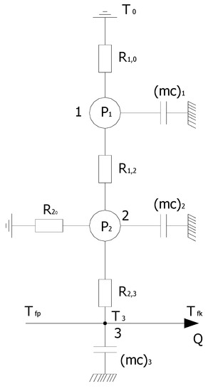 Thermal streams P flow between the network nodes and the loss center (environment) with thermal resistance R. Thermal resistances present in the diagram (Figure 1) have the following physical sense: