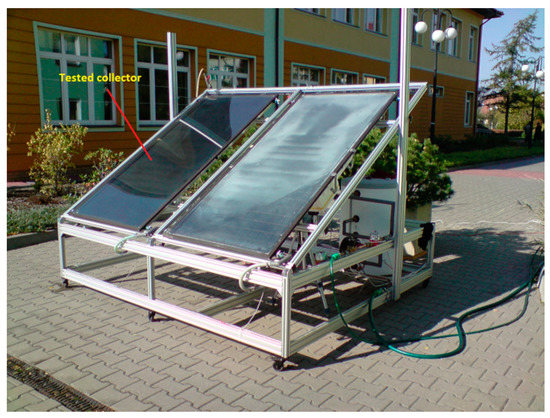 The operating cost of each segment of a hybrid system depends mainly on the resulting efficiency of a solar installation. In practice, the lower efficiency of a solar system translates into higher consumption of fossil fuel, which generates higher operating costs. Therefore, experimental work is still being carried out on new collector constructions [4] and the possibility of long-term energy accumulation using phase change materials [5], such as trigeneration systems [6]. It is possible to achieve optimization of the operation of a solar installation (solar system capacity increase) using smooth flow control of the working medium that should be adjusted to the existing operating conditions (solar radiation intensity, temperature of the medium, water temperature in the storage tank) [7]. It is possible to develop the control system of a solar segment in a hybrid installation based on the dynamic properties of the solar collector represented by the time constant determined using a step response [8]. For over 40 years, the procedures of testing solar collectors have been undergoing development, testing, comparison and verification in order to create a procedure that would allow determining the thermal behavior of a solar collector without performing expensive and complicated experimental tests, usually based on the steady state condition. The proper determination of the static and dynamic properties of a solar collector is of key significance, as they constitute a basis for the design of a solar heating installation, as well as a control system. In spite of the continuing development of the concepts of adjusting the operation of a solar heating installation based on the simplest proportional controller [9], proportional and on-off fluid flow control algorithm [10], proportional-derivative control algorithm [11], through continuous adjustment using a Proportional Integral Differential PID regulator [12,13] and ending with complicated fuzzy algorithms [14,15], learning algorithm [16], and artificial neural networks [17] improving the performance of thermal solar collector, the ensuring of required control quality still remains an issue. They probably arise from the fact that the static and dynamic parameters of solar collectors determined in laboratory tests can be different under operating conditions. Although the quality standard ISO 9459-4:2013 [18] was developed to test solar heating systems under operating conditions, it does not allow determining the thermal behavior of a solar collector. It is therefore important to conduct simulating and operating tests enabling the performance of a comparative analysis intended to indicate the degree to which the static and dynamic properties of a solar collector depend on the method used for their determination.