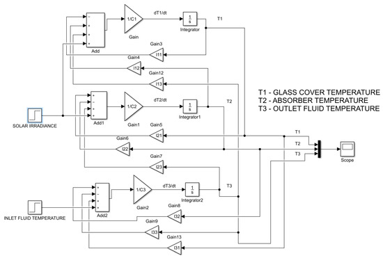The ETN method developed by Chochowski [44] was used to analyze the static and dynamic properties of the tested solar collector during the design process. The specific values of heat resistance were calculated based on the collector material data. The thermal network was implemented in Simulink (Figure 9). The simulation was performed in accordance with the standard for a flow rate of 2.16 dm3/min. Figure 10 shows the step response of the tested collector, prepared for a solar irradiance value of 1000 W/m2 and a working medium inlet temperature of 20 °C. In contrast to other methods, the ETN method allows an analysis of the impact of structural parameters on the energy flow and temperature distribution between specific homogeneous bodies of the collector. Therefore, it was possible to develop a step response for the glass cover, the absorber and the working medium.