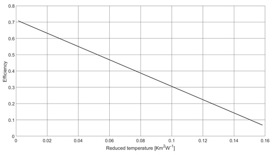 Efficiency characteristics were determined described using relation Equation (21) using the method of least squares. When analyzing the characteristics, it should be noticed that the collector zero-loss efficiency is slightly lower than the efficiency determined under indoor conditions and amounts to 77%, whereas the coefficient of temperature-dependent heat losses is significantly higher and amounts to 54.8 W/m2K2 (Table 2).