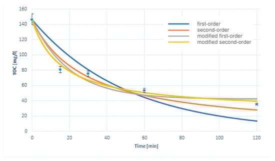 The mechanism of the treatment process is very complicated. It includes both homo and heterogeneous catalysis reactions, as well as coagulation, sorption, and co-precipitation. These processes are at least somewhat independent of each other, sometimes even antagonistic. The first stage of the results analysis was the selection of a kinetic model describing the mechanism of the process. The least squares method was used to select the best model, as shown in Equations (4)–(7). The exemplary models matching results are shown in Figure 1. As the optimal model, second-order kinetics with modification was chosen. There was a slight discrepancy between the results obtained in the experiment and the results of kinetic modeling. In the case of longer process times, the TOC value from modeling is usually slightly higher than that obtained experimentally.