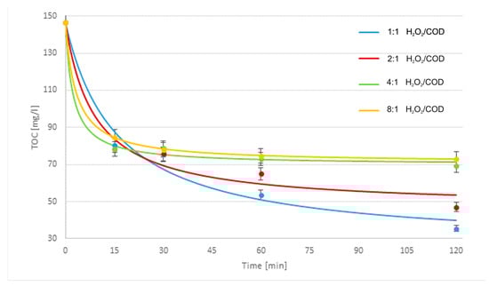 TOC has been found to be the most important parameter to control the effectiveness of the process. The main reason for choosing TOC as the basic parameter is the ease and simplicity of its implementation (TOC analyzer, determination time 10–15 min, depending on the sample). Additionally, an important criterion is a reliable measurement. In the case of COD determination, much more criteria must be met during the measurement to obtain a reliable result. Due to the known fact that the determination is based on the oxidation of compounds with a strong oxidant, potassium dichromate, the presence of additional oxidants/reducing agents in the system will influence the measurement. In the case of our experiment, the presence of metallic iron and hydrogen peroxide are the substances that may influence the COD measurement. In order to remove the effect of magnetic iron, a magnetic stirrer was used as a separating agent during the process. It was assumed that metallic iron would be attracted to the magnet and removed from the solution. In order to remove hydrogen peroxide, alkalization to pH 9.0 was employed, as hydrogen peroxide as a weak acid decomposes in an alkaline environment. As an additional effect, there is the coagulation of dissolved iron compounds. Therefore, the COD measurement can only be performed with a significant time delay. Before testing, it was made sure that all factors that might interfere with the correct COD determination were removed. The problem of the reliability of such a measurement was discussed in previous publications. Therefore, COD was only determined as an auxiliary, for control experiments after 120 min, as a check of consistency with the TOC results. COD was not measured at the intermediate times 15, 30, and 60 min. In the case of BOD, it is known to be a 5-day test. Therefore, BOD determinations were made only after the process time of 120 min, only in selected samples. COD and BOD5 determination results for the selected processes are shown in Table 2.