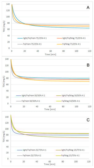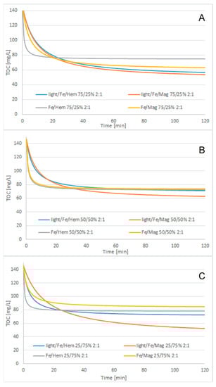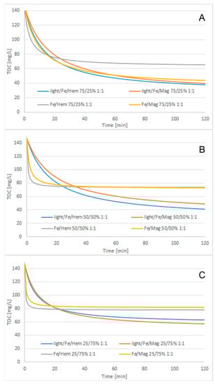 Treatment processes were carried out in a 1.5 L reactor filled with a 1 L sample. Doses of magnetite, hematite, Fe0, and 30% H2O2 (Stanlab, Lublin, Poland) solution used in the experiment were selected in preliminary tests. Wastewater samples were stirred (300 rpm) on a magnetic stirrer (Heidolph MR3000, Schwabach, Germany). The pH was adjusted to 3.0. After specified times (15, 30, 60, and 120 min), treatment processes were stopped by increasing the pH to 9.0 using 3 M NaOH (POCh, Gliwice, Poland). The samples were left overnight for the decomposition of unreacted H2O2 and for iron hydroxides sedimentation; then, TOC was determined in supernatant. The details of the preparation of the experiment are shown in Table S1.