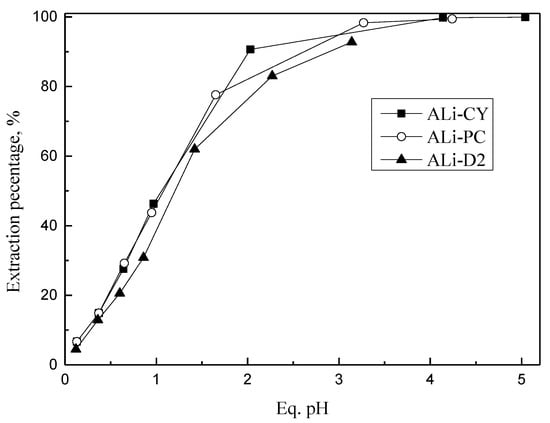 Equation (7) is related to the basicity of the weak acids. Since the product of acidity and basicity constants of a weak acid is equal to the water dissociation constant, the basicity constant of the weakest acid is the largest. Table 2 summarizes the pH change of the aqueous phase after extraction with the three ILs. Equilibrium pH was higher than initial pH, indicating that some of hydrogen ions was extracted by the ILs. Compared to ALi-D2, there is a larger increase in the equilibrium pH during the extraction with ALi-CY and ALi-PC. Among the three organophosphorus acidic extractants (D2EHPA, PC88A, and Cyanex 272), the acidity of Cyanex 272 is the weakest. Therefore, the basicity constant of the anion of Cyanex 272 is the largest among the three extractants. This is in good agreement with the increase order in the equilibrium pH (ALi-CY > ALi-PC > ALi-D2) observed in our data. This order is consistent with the pKa value of the organophosphorus acids (Cyanex 272 (6.37), PC 88A (4.51), and D2EHPA (3.42)). It can be said that the acidity constant of the three extractants affects the extraction of metal as well as hydrogen ions in our experimental conditions.