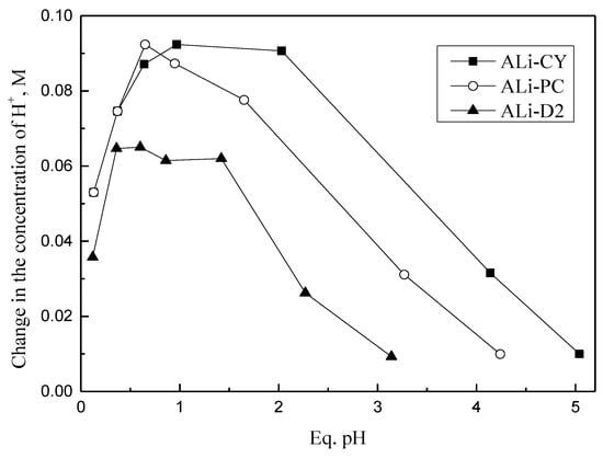 In Figure 1, the abnormal extraction behavior of both metal ions can be observed. Namely, the extraction percentage of In(III) and Ga(III) increased as equilibrium pH decreased from around 1.0 to 0.12. Figure 3 represents the change in the concentration of hydrogen ions during the extraction with the ILs. It is observed that there is an equilibrium pH at which the maximum change in the concentration of hydrogen ions occurs. This is related to the basicity of the anions of the three ILs. Therefore, it can be concluded that the extraction of metal ions was enhanced by suppressing the extraction of hydrogen ions.
