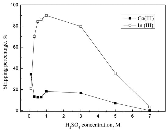 Effect of sulfuric acid concentration on the stripping of Ga(III) and In(III) from the loaded ALi-PC phase. (Loaded ALi-PC: [Ga3+] = 13 mg/L, [In3+] = 99 mg/L; [H2SO4] = 0.1–7 M).