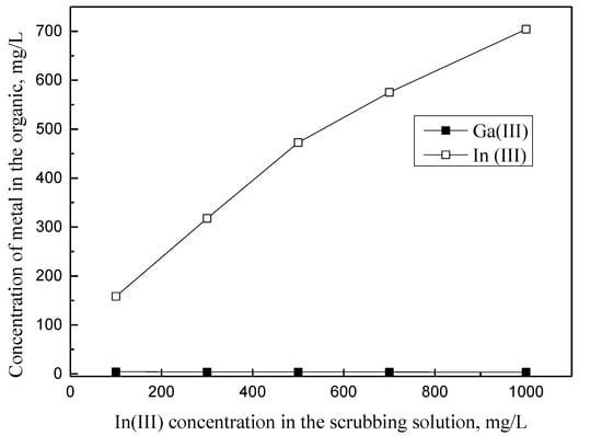 Stripping results indicated that it was impossible to selectively strip Ga(III) over In(III) from the loaded ALi-PC. Therefore, scrubbing experiments were conducted to remove Ga(III) from the loaded IL. For this purpose, the concentration of In(III) in the scrubbing solution varied from 100 to 1000 mg/L. The experimental results are shown in Figure 9. Prior to scrubbing, the concentration of Ga(III) and In(III) in the loaded 0.1 M ALi-PC was 13 and 99 mg/L, respectively. At this time, the purity of In(III) was 90.7%. As In(III) concentration in the scrubbing solution increased to 1000 mg/L, the concentration of In(III) in the loaded ILs increased steadily, indicating that the loading capacity of 0.1 M ALi-PC was not reached.