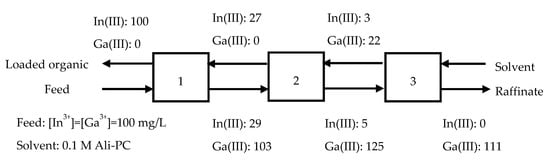 Figure 10 shows the McCabe–Thiele diagram for the extraction of In(III) from the mixed solution. When the volume ratio of the two phases is unity, two stages of counter-current extraction with ALi-PC would completely extract In(III). Considering the stage efficiency of counter-current extraction, batch simulation experiments for the three-stage counter-current extraction were conducted in this work. Figure 11 shows the composition of the raffinate in each stage. The composition of the two metal ions in the loaded organic phase was calculated by mass balance. Our results clearly verified that In(III) and Ga(III) were completely separated by three-stage counter-current extraction with ALi-PC. In the batch simulation experiment, there was a slight difference in the concentration of Ga(III) between the feed and the aqueous outlet. It might be thought that the concentrations of Ga(III) in the outlet were within the experimental error range.