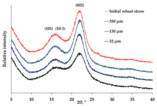 An analysis of the XRD patterns of the samples obtained at low temperatures revealed no significant changes; the crystallinity index remained within 60–65%. This proves that no significant changes are observed in the structure under the grinding conditions used, both at the level of the cell wall and its component, cellulose (Figure 3). In special experiments involving grinding in a mill, changes in the crystalline structure of cellulose were determined and the crystallinity index of plant raw material cellulose was calculated using the Segal method. The crystallinity index was calculated from the ratio between the intensity of (002) reflection (crystallinity peak) and the intensity of the minimum between the (101) and (10–1) reflections (amorphism peak) as shown in ref [16].