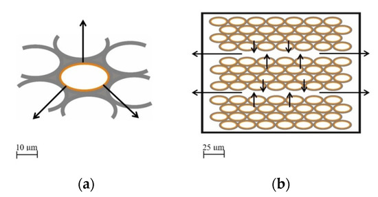 Scheme of the main diffusion fluxes of resveratrol in water extraction (indicated by arrows) for a particle of 32 μm (a) and 350 μm (b).