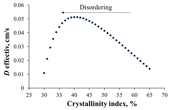 Figure 6 shows that the dependence has a maximum corresponding to the crystallinity index of 42%. At higher crystallinity indices, the mass transfer decreases as diffusion through the cell wall is impeded. A drop in mass transfer is observed at crystallinity indices <42% due to the disappearance of pores.