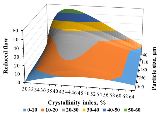 One can also see that the dependence between the flow and the crystallinity index is dome-shaped within the entire simulated range. There is also an inverse dependence between the flow and the particle size, being consistent with the conventional observations that the smaller the particles, the better the extraction (with the optimal particle size) is.