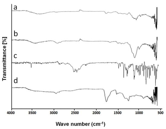 FTIR spectrum of HPMC E-5 shown in Figure 1b, displays characteristics peaks at 3519, 2867, 1386, and 1045 cm−1, revealing the presence of hydroxyl group (OH) stretching, C–H group, vibration of hydroxyl group (OH), and C–O group stretching, respectively. Spectrum of HPMC is confirmed through a literature study performed by Akhlaq et al. [26]. They observed characteristic peaks at 3421.48, 2891.10, and at 1377 cm−1.