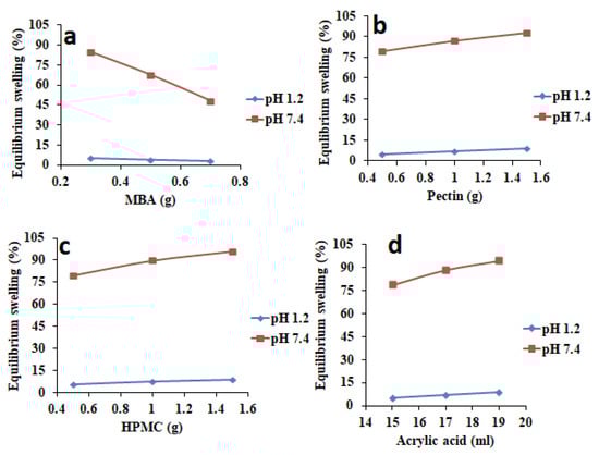Influence of variable amounts of (a) methylene bisacrylamide (MBA), (b) pectin, (c) HPMC, and (d) acrylic acid on swelling percentage of fabricated hydrogels.