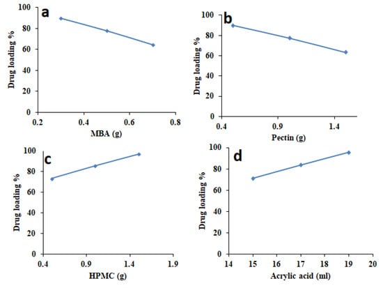 Drug loading efficiency was established to find out the drug percentage entrapped in hydrogel discs. Impact of MBA, pectin, HPMC, and acrylic acid contents on drug loading efficiency is also discussed below.