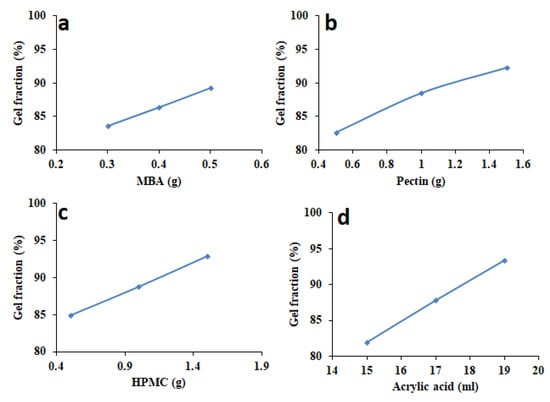 Influence of variable amounts of (a) MBA, (b) pectin, (c) HPMC, and (d) acrylic acid on gel fraction of HPMC-pectin-co-acrylic acid hydrogel.