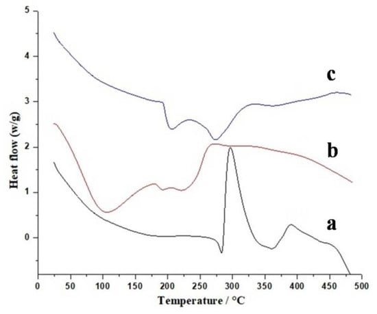 Thermal analysis is a powerful tool that gives us information about thermal stability of drug, pectin, and prepared hydrogel. DSC and TGA investigations were performed at 0–500 °C range. Figure 5 presents DSC thermograms of Galantamine hydrobromide, pectin, and fabricated hydrogel. Figure 5a displays a small endothermic peak at 280 °C, which represents the melting point of Galantamine hydrobromide. A sharp exothermic peak was shown at 295 °C due to degradation of drug molecules. DSC thermogram of pectin (Figure 5b) presents first endothermic peak near 110 °C, which is Tg of pectin and is due to moisture content. One more endothermic peak is observed at 185 °C due to its melting point. Exothermic peak at 275 °C was due to complete degradation. Mittal and Kaur [30] reported similar results of thermal analysis of pectin. Thermogram of HPMC-pectin-co-acrylic acid hydrogel is given in Figure 5c. DSC results show that the first endothermic peak occurred at 200 °C and the second one at 285 °C.