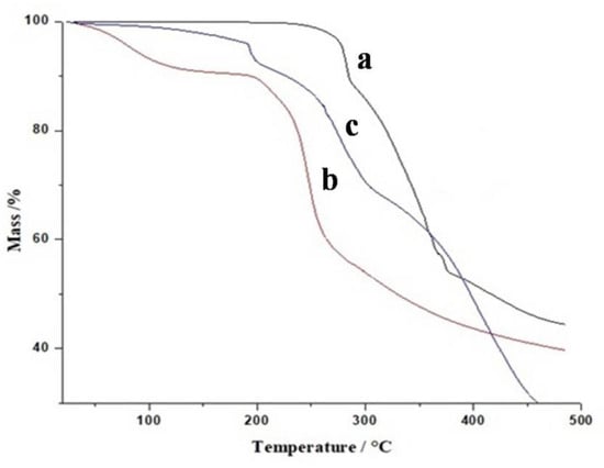 TGA thermogram of Galantamine hydrobromide (a), pectin (b), and formulated hydrogel (c).