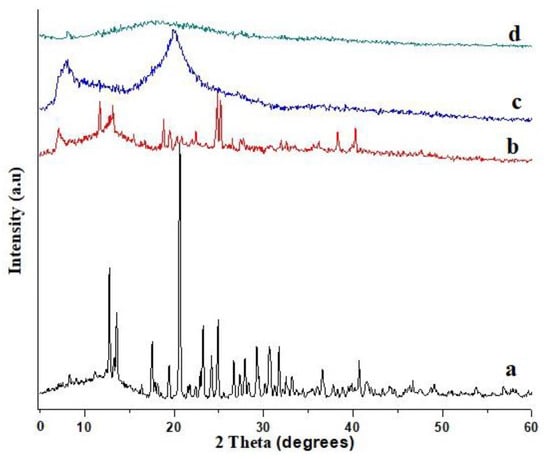 Diffractogram of Galantamine hydrobromide (a), pectin (b), HPMC (c), and formulated hydrogel (d).