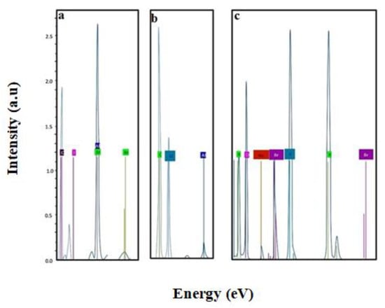 Energy dispersive X-ray (EDX) spectra of Galantamine hydrobromide (a), unloaded hydrogel (b), and drug loaded hydrogel (c).