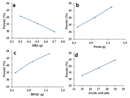 Influence of variable amounts of (a) MBA, (b) pectin, (c) HPMC, and (d) acrylic acid on porosity percentage of formulated hydrogels.