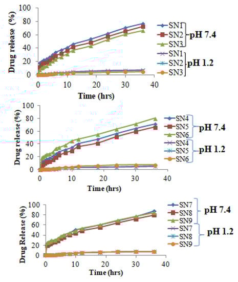 This investigation was carried out on dissolution apparatus II for all formulations of HPMC-pectin-co-acrylic acid hydrogels. Drug loaded hydrogels discs were weighed and then immersed into 900 mL buffers of pH 1.2 and 7.4 individually. Samples were withdrawn after definite time interval from 0 to 36 h and scanned at 287 nm wavelength for absorbance. After applying software program DD solver, release kinetics was calculated. The influence of variable amount of MBA on drug release percentage (SN1–SN3) is represented in Figure 11. Drug release percentage was higher at alkaline pH as compared to acidic. Results showed that when MBA amount was increased, percentage of drug release decreased from 77% to 66% at pH 7.4. Increased cross-linker amount caused more physical entanglement resulting in denser hydrogel structure, which hindered drug release from the polymeric network. At pH 1.2, negligible amount of Galantamine hydrobromide was released as compared to pH 7.4.