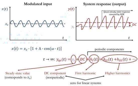 In our research, we use the term nonlinear frequency response (NFR) for a quasi-steady-state (often called periodic steady-state) response of a stable, weakly nonlinear system to a sinusoidal input change with a relatively high amplitude [9]. The quasi-steady-state response is obtained when the transient response of the system vanishes and it can be described as a sum of the first (basic) and, theoretically, an infinite number of higher harmonics, a nonperiodic (i.e., constant-in-time) term (DC component) and the steady-state operation value (Figure 1). For linear systems, or when the forcing amplitude is sufficiently small, both the DC component and all higher harmonics become zero.