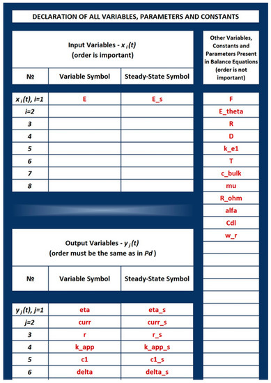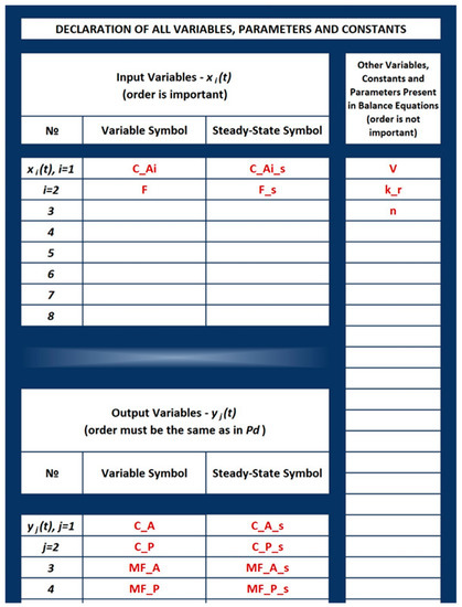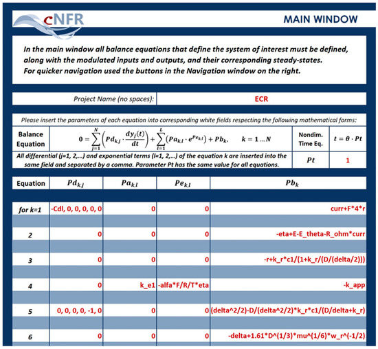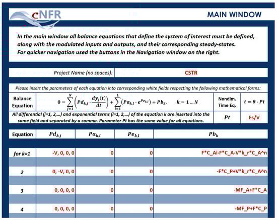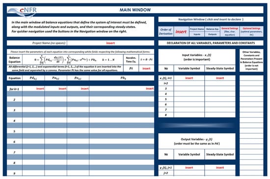 Output variables defined by the dynamic model Equations (6)–(9) are: , , , and . The input and output variables, their steady-state symbols, and other constants from Equations (6)–(9) are declared in the Main Window of the cNFR application, as shown in Figure 7.