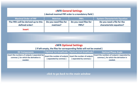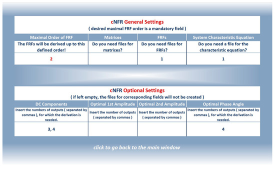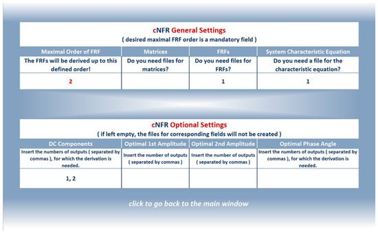 By clicking on “General and Optional Settings”, or “Order of Derivation” button, the user is transferred to the Settings Window, shown in Figure 5. In the Settings Window, the user can choose to derive the DC components and the optimal amplitudes and phase angle for the chosen output of interest. Also, the user can select whether the cNRF application will automatically generate files for matrices, FRFs, and the characteristic equation. The only mandatory field in the Settings Window is the “Maximal Order of FRF” which defines the order up to which the cNFR application will derive the FRFs.