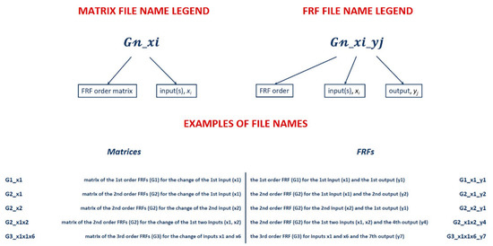 At the bottom of the Settings Window the user can see the Legend Window (Figure 6) that explains the names of the matrix and FRF files automatically generated by the cNFR application, along with some examples. The file generated for matrices contains FRFs of all outputs defined (Figure 4) and -th input. E.g., matrix file name G1_xi would contain the matrix with the first-order FRFs of all outputs for modulation of the -th input variable. On the other hand, FRF file names contain only one FRF for a -th output and -th input. In systems with a very large number of output variables, it is convenient and faster to create only files for matrices instead of number of files for FRFs, as all necessary FRFs can be easily withdrawn from the matrices.
