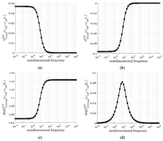 Comparison of the classically derived functions (symbols) and automatically derived functions using the cNFR application (line): (a) the second-order asymmetrical FRF for the product molar flow rate () and modulated inlet concentration (); (b) the second-order asymmetrical FRF for the product molar flow rate () and modulated inlet volumetric flow rate () and the real (c) and imaginary (d) part of the cross FRF ( and ) for the product molar flow rate, ().