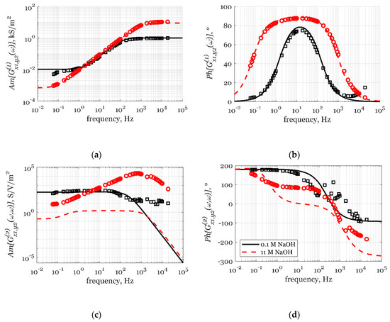 Comparison of the theoretical, cNFR derived (lines), and experimental obtained (symbols) dimensional FRFs: (a) amplitude of the first-order FRF; (b) phase of the first-order FRF; (c) amplitude of the symmetrical second-order FRF and (d) phase, of the symmetrical second-order FRF relating the current density as the output, and electrode potential as the modulated input for two different NaOH concentrations: 0.1 M and 11 M NaOH (black and red, respectively).