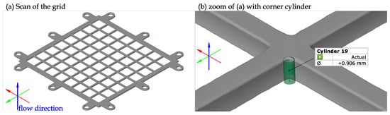 The grid is placed in the inlet of the wind tunnel test-section. The geometry has been prepared within the language OpenSCAD, whose applicability for scientific modeling has been explored in more detail, e.g., in []. The grid was manufactured by using 3D printer Prusa Mk2.5 and it was made from polymerized lactic acid (PLA) [].