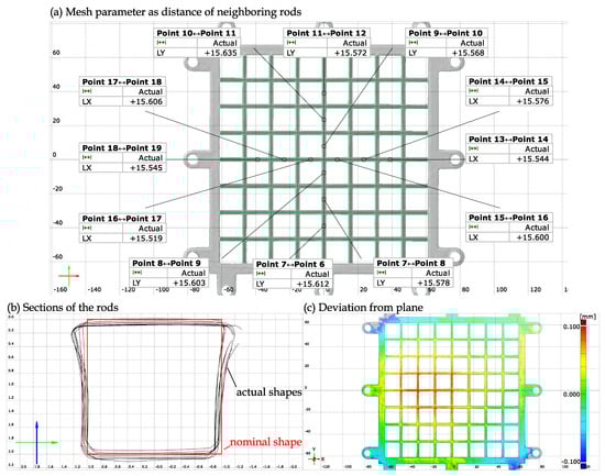The scan of the grid shows various relevant deviations to the projected geometry. The most relevant is the test of the main length-unit M. It was found by measuring the distance between neighboring rods fitted by cylinders displayed in Figure 2a. The actual mesh parameter (i.e., the distance of neighboring cylinders) , which is of the expected value. The standard deviation of such an ensemble is only , which means that the 3D printer prints inaccurately, but stably.