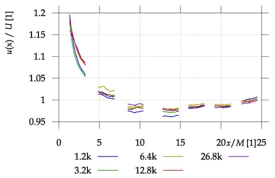 The development of ensemble-averaged stream-wise velocity u is plotted in Figure 4. It is normalized by the average of all ensembles U, which somehow represents the velocity in front of the grid, which is not measured as that area lies inside a metallic part of the wind tunnel without optical access. The average velocity is shown as a function of distance from the grid x normalized by the mesh parameter M. In the near region, the flow field is dominated by the system of wakes and jets, but the measured section cannot be a representative one, as there are not only sections like this (i.e., past the holes and rods oriented perpendicularly), but also sections past the in-plane rods. Therefore, the mass flow in the studied section is larger than the total one containing also sections past rods only. When the pattern of jets and wakes disappears, the velocity corresponds to the total mass flux. However, in later stages, another effect starts to play a role: the boundary layers of the channel slowly grow accelerating the fluid in the center of the channel in order to maintain the total mass flux.