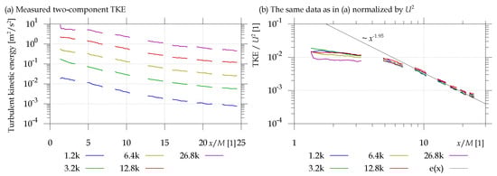 In in Figure 5, the left panel shows the development of turbulent kinetic energy with distance from the grid. Note that the turbulent kinetic energy is calculated only based on the in-plane fluctuations; therefore, it is underestimated by the third component. The number in the legend is the mesh-based Reynolds number, where k plays for . The right panel displays the same data normalized by the average stream-wise velocity U. The function fits the dependence in the far stages. Experimentally, we have found that the turbulent kinetic energy e decays with distance from the grid x as (see black line in Figure 5). Some authors, e.g., [], use a little bit more complicated function with virtual origin ; we prefer to keep the function as simple as possible not introducing too many fitting parameters, because, as John von Neumman said, With four parameters I can fit an elephant, and with five I can make him wiggle his trunk []. In any case, it converges reasonably well within the experimental noise. We can use this function to estimate the energy dissipation rate . The definition of the turbulent kinetic energy dissipation rate is